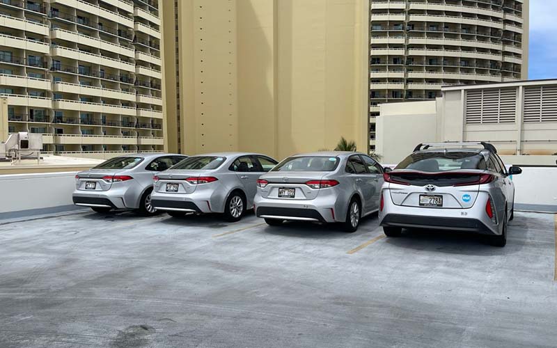 The car rental station is located in the Sheraton Waikiki parking lot. Look for the Aloha Landing parking garage elevators near the round-about at the intersection of Don Ho Street and Royal Hawaiian Avenue. Head upstairs to the seventh floor. The vehicles are located in the corner of the lot. The station is a two-minute walk from the Royal Hawaiian Center in Waikiki. The vehicles are equipped with license plate readers, which allows easy access in and out of the station.